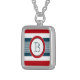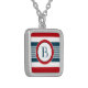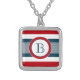 Nautical themed design with monogram decoration in round shape on blue, white and red striped background
