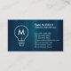 Monogram Electrician Electrical Contractor business card features a bulb icon over a faux blue metallic texture . Perfect for electric, electrical, electrical contractor , electricity, contractor, handyman, house repair, home repair.