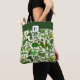 Monogrammed tote shopping bag with an elegant botanical leaves foliage pattern and personalized monograms in black on a green stripe at the top at the front and back side.