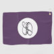 The elegant monogram dark plum purple golf towel has a solid purple background with a large white circle design outlined in grey. The last name monogram letter is centered in circle along with the full first name in black. This golf towel is great gift for Birthdays, Mother's Day and more!