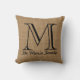 Monogram and family name printed on faux burlap decorative throw pillow.