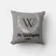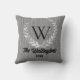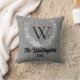 On this Stylish pillow is a grey rustic wood with a letter that you can customize in the center joined with an elegant silver laurel wreath for extra pop then below that is an area where you can customize it with your name and date. Rustic elegant vibes.