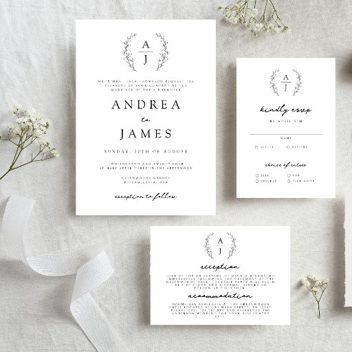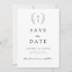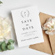A formal and minimalist yet simple and elegant wedding save the date featuring monogram crest of the bride and groom's name and a combination of sans serif and script calligraphy font.