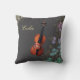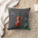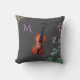 Monogram Floral Violin Design Throw Pillow. A dark wood violin on a black pillow with a floral pattern in gold, purple, pink and blue. Fill in your name and initial or give to your favorite violinist, musician or music lover.
