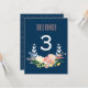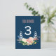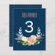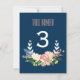 A fresh and modern illustrated floral wreath surrounds the table number on this colorful blush and navy floral table card.