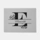 On this distinctive door mat, your name is in script at the center of a divided flourish letter E. The name and letter are in black, and shown on a medium to light gray background. You may change the background color, if you'd like, by choosing to Edit Design. Elegance for your entryway!