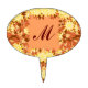 Script monogram framed with a trellis of yellow flowers and leaves in shades of cocoa, dark chocolate and beige, with a light cocoa background