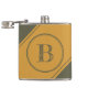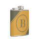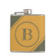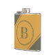 This flask features a centered double circle and initial letter in moss green on a mango yellow background. Personalize or remove the initial letter or customize using the design tool to select a font color, size, and style your prefer. A fun custom gift idea for a 21st birthday.