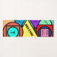 Monogram initial in black text on bottom teal circle. Yoga typography. Funky geometric pattern with blue, red orange, pink, teal, purple, yellow, teal green, brown. Fun geometric shapes in circles, triangles, rectangles pattern. Backside is solid brown color. Original Design © TamiraZDesigns.