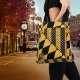 A modern designer bag featuring a playful pattern in black and ocher with gold (print). You can customize or delete the monogram text as well as scale or rotate the pattern if you like.