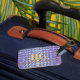A gold monogram on gold, blue and purple iridescent geometric design.