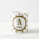 This monogram morning tea or coffee mug is a unique gift for someone special. A gold star pattern appears against a white background. A letter "A" monogram is featured in a center circle in a golden yellow color along with a first name. Easily customize the colors and text to suit your desire.