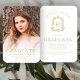 This elegant graduation hand fan features a photo of the graduate with a gold text overlay. The word "graduate" appears in decorative outline typography. Add the graduate's name, school and class year below. The back features the word "congratulations" above an elegant vintage crest surrounding a gold monogram initial on a white background, with the name, school and class year below.