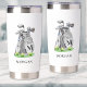 This elegant travel mug features a stylish gray watercolor golf bag filled with clubs, surrounded by a touch of green grass. The design appears on both sides of the mug for easy viewing. A simple serif font initial monogram is placed directly on the golf bag, blending seamlessly into the overall design. Below the monogram, the full name is displayed in a matching serif font for a classic and personalized touch. The monogram is currently in a dark gray, almost black, to match the bag's accents, but it can be customized to any color you prefer.
