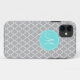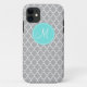 A must-have phone case for girly girls! An aqua blue circle background highlights the monogram. A gray quatrefoil pattern gives this phone case a preppy, chic look. Customize your phone case today!