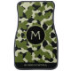 Monogram Green Camo Cow Spots Car Floor Mat set with CUSTOMIZABLE TEXT. Stylish, trendy, bold cow print car floor mats set in black and shades of green. In the middle there is a large circle with a placeholder pale green lettered monogram, which is CUSTOMIZABLE. There is additional placeholder text at the bottom which reads MY GOD IS FAITHFUL. This is also customizable, so you can create your own text (eg. add your name or simply delete. When it's time for a statement car update, surely you can't go wrong with some bold cow spot patterns... Choose from a wide selection of stylish car floor mats by Berean Designs.