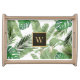 A watercolor pattern of vibrant green tropical leaves and plants fills the background of this stylish serving tray. Your initial is elegantly displayed in a black and gold framed box for instant personalization. Bring an instant tropical vibe to your vacation rental, pool house, summer parties, and more. Also great for gift giving. Original watercolor illustration and design © 1201AM Design Studio | www.1201am.com