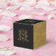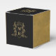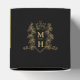 Black and gold colored monogram wedding or event favor box. Ideal for a black and gold themed wedding favors. Other matching wedding items available. © Monogram crest with a heart crown on top and entwined with berries and leaves original hand drawing and design by Sarah Trett for www.mylittleedenweddings.com exclusively on Zazzle.