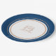 White and gold colored monogram wedding plate. Ideal for a deep dark navy blue, white and rose gold themed wedding. Other matching wedding items available. © Monogram crest with a heart crown on top and entwined with berries and leaves original hand drawing and design by Sarah Trett for www.mylittleedenweddings.com exclusively on Zazzle.