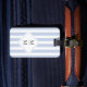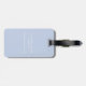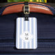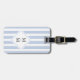 Luggage tag featuring a light dusty blue and white striped pattern with your monogram initials in dark gray over a white diamond shape. All colors are customizable.