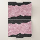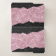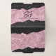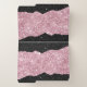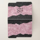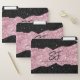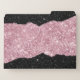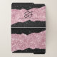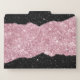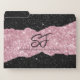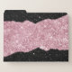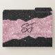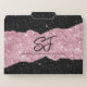 These professional custom file folders feature a glamorous black and pink glitter design. The background features a soft pink glitter pattern. The top and bottom portions feature an abstract, luxurious black glitter. Sample monogram initials are printed in the center in an elegant script font, followed by a name and job title.