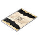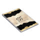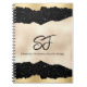 This professional custom notebook features a glamorous black and gold design. The background features a textured gold foil style pattern. The top and bottom portions feature an abstract, luxurious black and gold texture with accents of glitter. Sample monogram initials are printed in the center in an elegant script font, followed by a name and job title. You can personalize the notebook to include your own custom name and initials, or other text of your choice.
