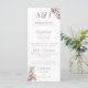 This elegant wedding menu features an elegant floral theme with beautiful hydrangea flowers. Two sample monogram initials are printed in the top portion. You can personalize the menu to include your own initials and custom food options. A delicate bouquet of watercolor pink and white hydrangeas is printed in the top right, and another in the bottom left.