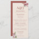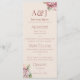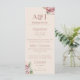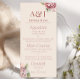 This elegant wedding menu features an elegant floral theme. Two sample monogram initials are printed in the top portion. You can personalize the menu to include your own initials and custom food options. A delicate bouquet of watercolor hydrangea flowers is printed in the top right, and another in the bottom left. The hydrangeas are a romantic pink and blush.