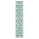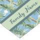 Customize this elegant floral table runner with a pattern of palm fronds and frangipani on a sky blue background with your family name. Perfect for decor with beach vibes.