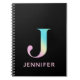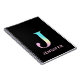 Chic personalized black notebook with a "J" initial monogram in large bold type with a pink, yellow, mint green and teal blue rainbow gradient. Add your name below in simple pink typography.