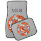 Two koi float to form a circle in this gentle Japanese Anime design in orange and white. The background is gray with deeper gray letters for the monogram on the front two mats. However, the colors can be changed to coordinate with your vehicle. You can also delete the letters completely if you prefer not to have the monogram, which is in a bold Oriental font.