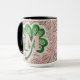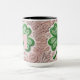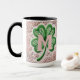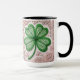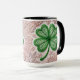 A cute and whimsical green shamrock on a girly coquette background made of dusky pink and green delicate lace.