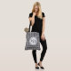 Stylish large black and white buffalo check shoulder tote bag with a double-framed monogram circle. Dimensions are 18" x 18" with a 28" strap; a smaller 16" is also offered. The exterior is 100% sturdy brushed polyester; interior is 100% polyester nonwoven laminate. Printed and then sewn for edge-to-edge designs. See "About" for more information and care. Made in the USA.
