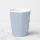 This paper cup design features a graphic of a white leaf wreath on a light dusty blue background. Personalize with the names of the bride and groom and their wedding date.
