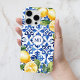 Monogram Lemon Citrus Fruit Elegant Mediterranean iPhone 15 Pro Max Case features bright yellow watercolor lemons and green leaves layered over a classic blue and white Mediterranean tile background. Centered with a clean monogram, it brings stylish Positano and Amalfi Coast vibes to your everyday essentials. A fresh, personalized look perfect for summer or spring.