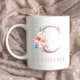 A floral personalized coffee mug with a name and rose pink monogram letter "C", and with a decorative watercolor foliage and flowers.