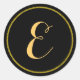 Monogram E in script, gold colored on black background with gold-colored circle frame
