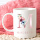 A floral personalized coffee mug with a name and rose pink monogram letter "M", and with a decorative watercolor foliage and flowers.