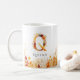 Elegant watercolor leaves frame the bottom of this mug while the letter Q is a collage of festive fall element of red orange and yellow leaves, Personalize with a name to make it uniquely yours.