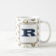 This monogram morning tea or coffee mug is a great way to add a personalize touch to your morning routine. A golden polka dot pattern appears against a white background on both sides of this mug. The letter "R" is featured in a square. The letter can not be customized however if you are looking for another letter, please visit my store.