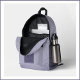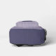 This backpack features a monogram patch in purples on the front over a multi-line weave-like plaid design in mauve, lilac and lavender purples, with solid purple half panels on he side.