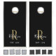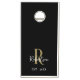 Minimal minimalist simple elegant corn hole set. Customizable personalizable with gold initial letter, white calligraphy script family name and established year. All on elegant classy stylish black background. For your family and friends gatherings to spend fun relaxing time together, playing outdoors games. Or sport lawn game gift idea, thoughtful, creative and useful for newlyweds, new homeowners, as housewarming keepsake gifts.