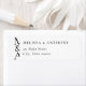 Minimalist wedding return address labels with custom monogram initials and names in modern black and white typography.