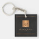 Luxury elegant black leather look keychain with a gold glitter monogrammed square and personalized name signature.