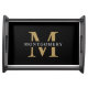 This modern minimal personalized serving tray has a gold monogram split initial with name inside on a black background.
