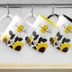 A monogram mug that features your name, cow illustrations, and sunflowers. The mug has a yellow, white, and black color scheme. Simply customize the name and monogram, add this mug to your cart, and enjoy cows and flowers with every warm beverage.