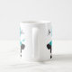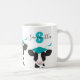 A monogram graduation mug that features a custom name and cows in graduation caps. The mug has a blue, white, and black color scheme. Simply customize the name and monogram, add this mug to your cart, and let your graduate enjoy cows with every warm beverage.