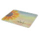 This floral cutting board is decorated with a yellow sunflower on a colorful watercolor background.