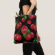 Cherries pattern all-over print tote bag is bold and colorful with bright red single and paired cherries arranged in a random pattern with leaves and stems still intact as if just picked from the cherry tree on a customizable black background with custom monogram and name - by katz_d_zynes