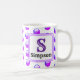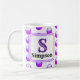 This monogram tea or coffee mug is a great way to add a colorful accent to your morning routine. A bright purple polka dot pattern appears against a white background on both sides of this mug. The letter "S" is featured in a square along with the family name. The letter and your name can quickly and easily be personalized.